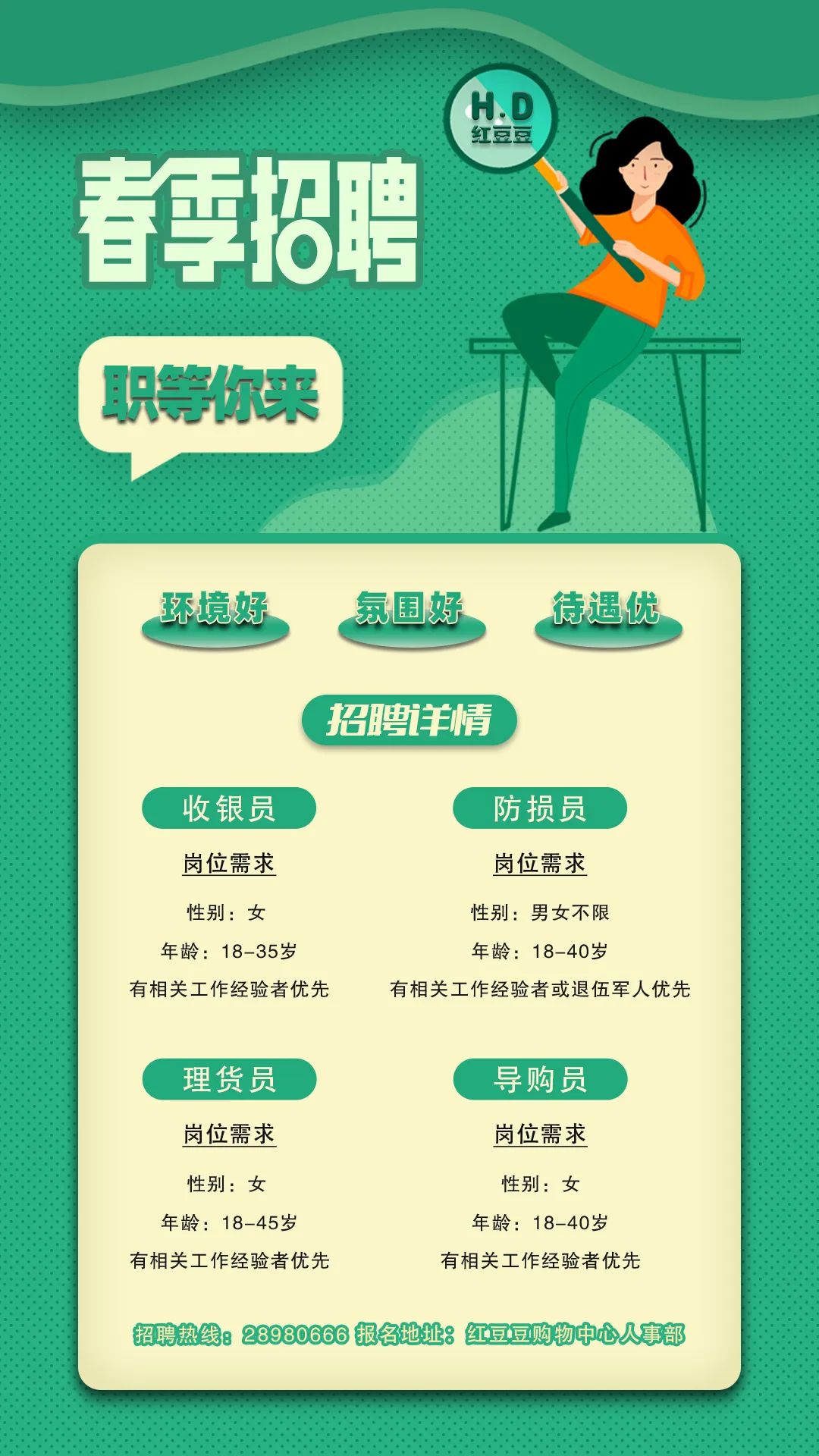 >【红豆豆购物中心】春季招聘进行中,环境好,待遇优,职等你来!