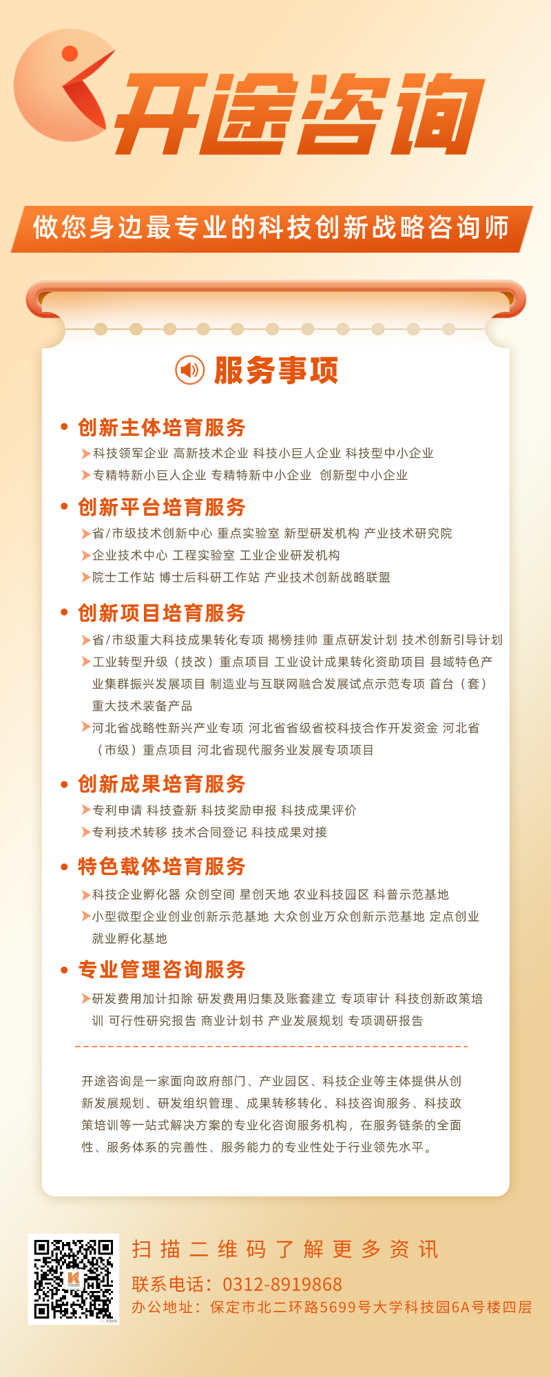 保定开途信息咨询服务有限公司于2016年10月成立于保定国家高新技术产业开发区,是一家面向政府部门、产业园区、科技企业等主体提供从创新发展规划、研发组织管理、成果转移转化、科技政策咨询、科技政策培训等一站式解决方案的专业化咨询服务机构。开途自成立以来一直专注于为企业转型提升解难纾困,满足企业不同阶段的创新发展需求,在基础服务能力、服务体系搭建、合作机制建设等方面取得了显著成效。