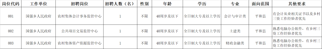 月薪2500 | 漳州市平和县国强乡人民政府招聘3人