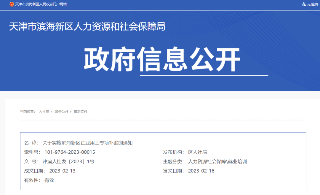 本补贴政策自2022年12月1日起实施,试行期限截至2023年12月31日,各补贴项目具体操作按照《滨海新区企业用工专项补贴政策实施细则》执行。