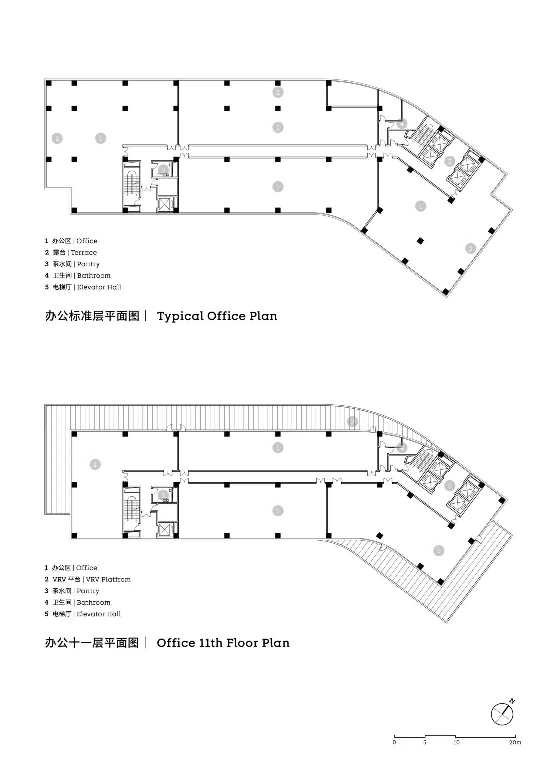 为规避对视影响,建筑师将核心筒布置于建筑中的相对消极空间——楼栋间距最近的转角处。为强化“峡谷”的空间层次,建筑师在3层、11层高度设计了局部退台,种植绿色植物,为办公人群提供工作之余放松身心的平台。“扭转”后的建筑在场地四周留出尺度适宜的小型广场,具有强引导性的弧形界面展现出全然的开放姿态,吸引四面八方的人们从城市街道走进场地内部,或参与商业消费,或漫无目的地游走闲坐。▲办公楼入口 ©RudyKu