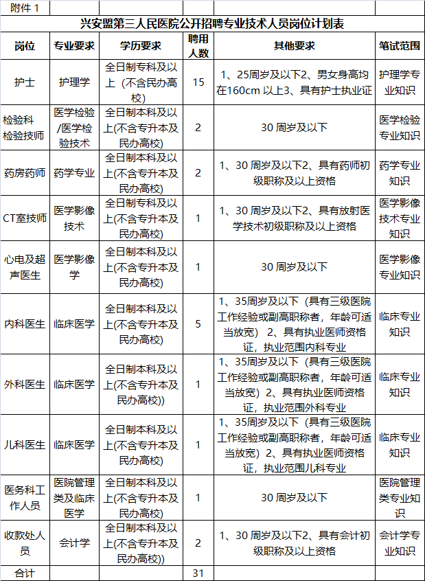 此次共招聘31人,其中招聘护士15人、检验师2人、药师2人、CT室技师1人、心电及B超室医生1人、内科医生5人、外科医生1人、儿科医生1人、医务科工作人员1人、收款处2人。详见《兴安盟第三人民医院公开招聘专业技术人员岗位计划表》(附件1)