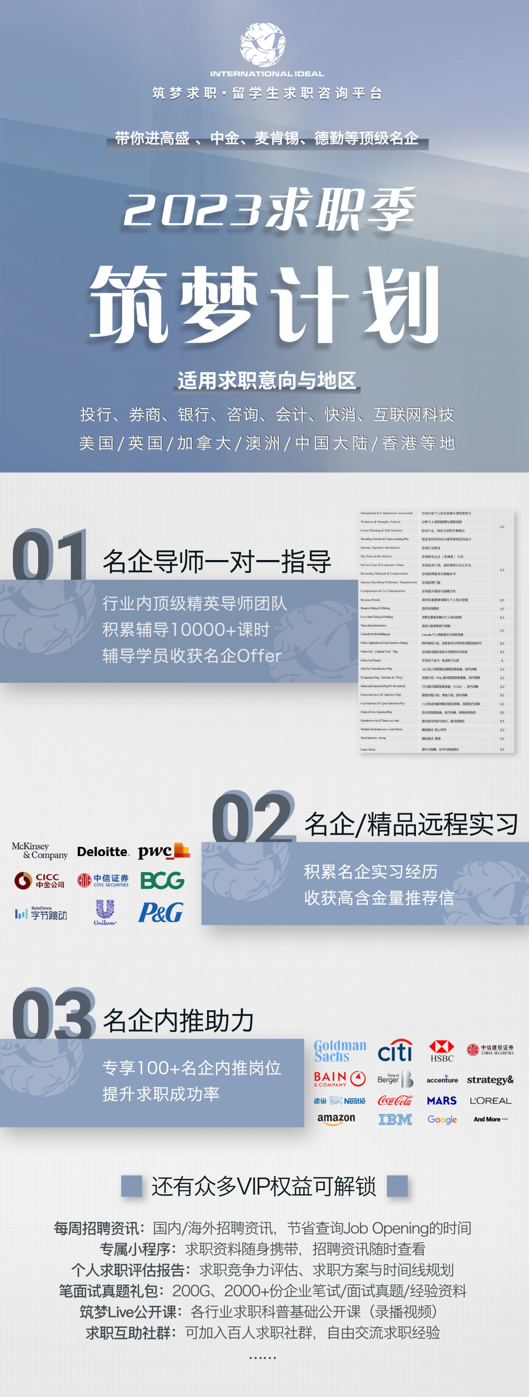 筑梦求职 INTERNATIONAL IDEAL ,2014 年成立于美国,是北美最早成立的留学生求职咨询平台之一。我们是宁波人才服务中心战略合作伙伴,并荣登福布斯全球华人精英TOP100及胡润百富创业领袖榜单,至今已帮助 8000+ 学员获得来自 Goldman Sachs, McKinsey, Deloitte, P&G 等企业 offers。我们的服务包括:求职咨询、背景提升、名企内推、海内外招聘等;商务合作请联系:Coop@internationalideal.com