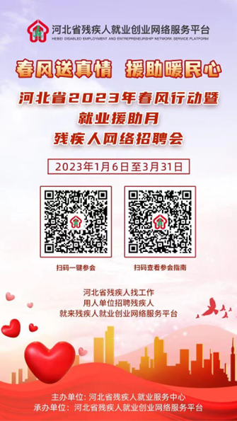 为深入实施就业优先政策,推进残疾人实现更高质量充分就业,最大限度满足企业和求职残疾人需求,河北省在残疾人就业创业网络服务平台(https://hebei.cdpee.org.cn)开设