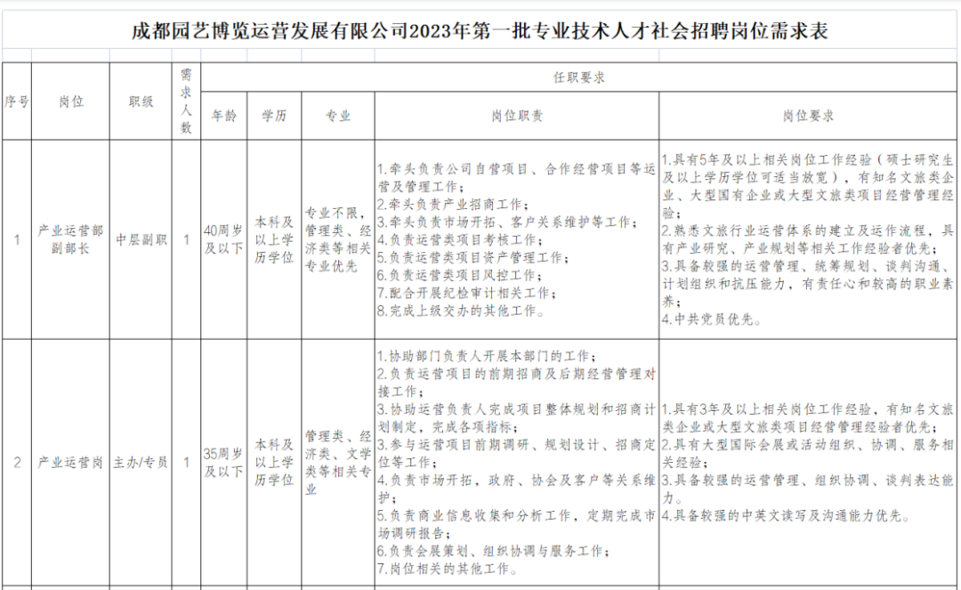 具体招聘岗位信息详见附件:《成都园艺博览运营发展有限公司2023年第一批专业技术人才社会招聘岗位需求表》。
