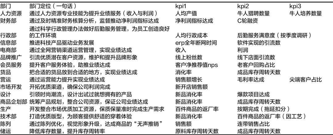 这就需要每个部门都有各自的KPI目标,具体看下图示例: