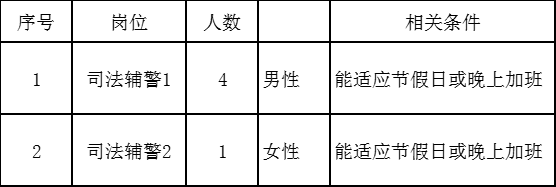 因工作需要,现决定面向社会公开招聘司法辅警5名,具体事项公告如下: