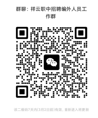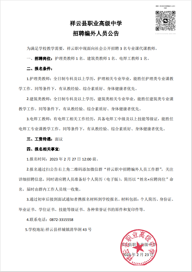 2.报名通过扫公告右上角二维码添加微信群“祥云职中招聘编外人员工作群”,关注详细招聘信息,同时请应聘人员准备好个人简历(电子版),简历以“姓名+应聘岗位”命 名,届时由群内工作人员统一收集。