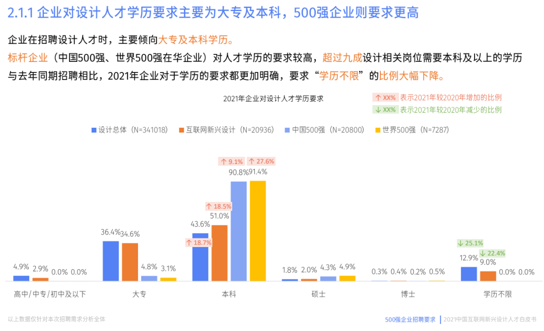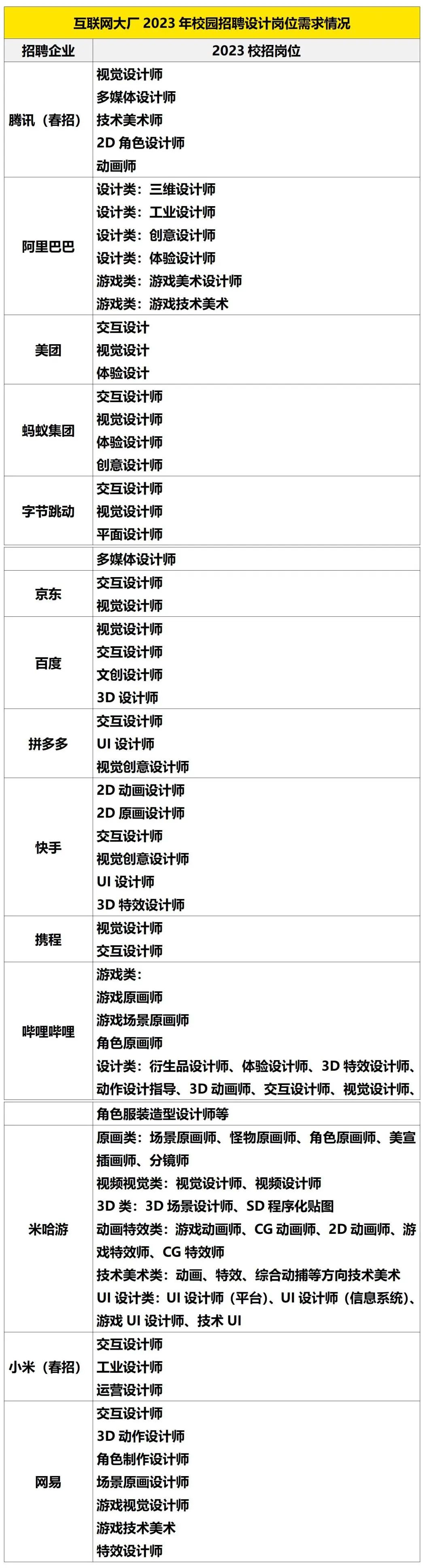 ▲香蕉美术 | 艺考生的升学规划和志愿填报顾问致力于为广大艺考生和家长提供专业、原创、权威的艺考资讯。每晚10点推送干货内容给你,帮你了解艺考考试趋势,抓住艺考升学红利。今天是蕉叔陪伴你的第 3110 天早关注一天,多一些了解大家好,我是蕉叔。除了部分家里比较有矿的同学,绝大部分同学读大学都是为了提升自己的能力,让自己能够更好地就业。如果大学毕业后,没有当公务员、进事业单位,那么基本上就是去企业工作。在企业工作,央国企比较稳定,福利待遇也比较好,但很难进。除了央国企,互联网企业的就业薪酬,福利待遇也相对比较好,尤其是互联网大厂。互联网企业的招聘岗位一般分为:技术岗、产品岗、运营岗、设计岗、市场岗、职能岗。其中,设计类岗是最适合学设计专业的同学的,但也并不是所有设计类专业都适合。学什么专业更容易进互联网大厂2022年9月,中国互联网协会发布《2022年中国互联网企业综合实力100强名单》。通过分析互联网前15强企业的2023年校园招聘岗位,我们可以知道:互联网大厂比较喜欢招聘的设计岗位是:交互设计师、视觉设计师、UI设计师、平面设计师、游戏设计师、动画设计师等。这些设计岗位一般都要求熟练掌握3ds max,maya,CAD,photoshop,AI等相关设计软件,而且要求具备较强的美术功底、审美水平以及手绘能力。除了美术设计专业能力以外,还需要有较好的产品能力、用户研究能力、运营能力以及商业能力。对于大学所学的专业,在招聘信息上则没有做非常硬性的要求,一般是美术、设计类专业优先考虑。不过虽然没有明确的要求,但从大学开设的课程来看,有些专业学到的东西跟互联网企业设计岗位的要求并不十分匹配。比如,工艺美术、陶瓷艺术设计、雕塑、服装与服饰设计、环境设计、实验艺术、美术学、艺术学理论等等。而视觉传达设计、动画、数字媒体艺术、产品设计等专业学到的知识则更符合互联网设计岗位的要求。互联网大厂对学历要求高吗根据腾讯发布的《2021中国互联网新兴设计人才白皮书》数据显示:互联网企业在招聘设计人才时,主要倾向于大专及本科学历。互联网大厂对学历的要求则更高,超过9成设计岗需要本科及以上学历。我们在梳理2022年中国互联网企业前15强企业的2023年校园招聘要求时也发现:几乎所有的设计岗位都要求本科及以上学历,只有极个别岗位接受专科毕业生应聘,但还要求要有相关的实习经验以及递交个人作品集。不过不管是专科学历还是本科学历,在各个互联网企业的招聘要求上几乎都提倡大家提交个人作品集。所以如果你想进互联网大厂,学历很重要跟专业能力都还重要。至于你是什么专业毕业的,没有太多硬性要求,因为从你的作品HR就已经看出你的水平了。好了,那今天的内容就先介绍到这里,如果你对艺考有任何疑问,请添加微信咨询我们(微信号:xjms000)。