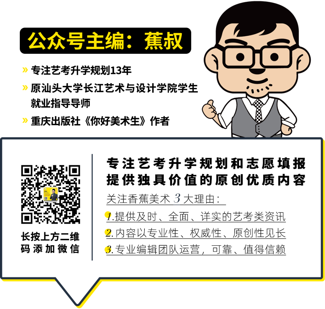 ▲香蕉美术 | 艺考生的升学规划和志愿填报顾问致力于为广大艺考生和家长提供专业、原创、权威的艺考资讯。每晚10点推送干货内容给你,帮你了解艺考考试趋势,抓住艺考升学红利。今天是蕉叔陪伴你的第 3110 天早关注一天,多一些了解