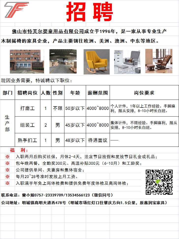 7、普工数名:待遇:计件工资4500-8000元/月。