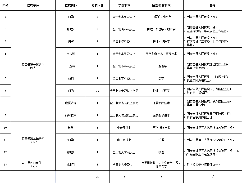 根据《安吉县卫计系统下属事业单位编外用工管理办法》(安卫计〔2016〕65号)文件精神,经研究决定,开展2023年安吉县卫生健康系统下属事业单位编外工作人员招聘工作,涉及3家下属医疗卫生事业单位,招聘岗位13个,招聘人数31名。现将有关招聘事项公告如下:
