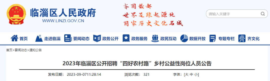 按照《淄博市交通运输局淄博市人力资源和社会保障局关于设置“四好农村路”类乡村公益性岗位的通知》(淄交公路〔2023〕7号)、《临淄区就业和农民工工作领导小组办公室关于印发〈临淄区城乡公益性岗位扩容提质行动2023年岗位计划〉的通知》(临就办〔2023〕1号)文件规定,经研究,面向社会公开招聘“四好农村路”临时性乡村公益性岗位人员1330名。现将有关事项公告如下:公益性岗位是指各级人民政府及有关部门开发并经人力资源社会保障部门认定,用于过渡性安置就业困难人员的岗位。临淄区城乡公益性岗位是依据《山东省城乡公益性岗位开发管理暂行办法》等文件要求设置并实施管理。根据工作需要对负责的农村公路、桥涵隧道、铁路沿线等基础设施进行巡护,以及完成所在用岗单位交付的其他临时性工作。我区脱贫享受政策人口(含防止返贫监测帮扶对象)、农村低收入人口、农村残疾人、农村大龄人员(45—65周岁)、户籍在村民委员会的抚养未成年子女的单亲家庭成员等群体。2.公职人员(含已退休)、镇(街道)备案且受财政供养或村(社区)集体经济补贴的村(社区)干部;8.正在接受司法机关、纪检监察机关立案侦查审查的;对公职人员或村(社区)干部直系亲属报名且符合条件的,经镇(街道)研究通过并报临淄区人力资源和社会保障局备案后方可上岗,对未如实说明的,按申报材料虚假失实予以清退。(一)拥护中国共产党的路线、方针、政策,遵纪守法,有较高的政治思想素质和良好的职业道德,品行端正,无违法违纪等不良记录。(二)具有岗位需要的专业和技能,符合岗位要求的身体条件,具有招用单位岗位所规定的其他条件。(三)居住地点距离责任公路较近,遇突发情况或紧急任务能及时赶到现场。招聘岗位详见《2023年临淄区“四好农村路”乡村公益性岗位一览表》(附件1)。(1)《2023年临淄区“四好农村路”乡村公益性岗位报名表》(附件2);2.报名时间:2023年9月11日—2023年9月13日上午8:30—11:30,下午13:30—16:004.报名方式:本人持报名材料现场报名,每人限报一个岗位。5.资格审查:资格审查工作贯穿整个招聘工作全过程。对本次招聘岗位拟聘用情况进行公示,时间不少于3天。公示期间有异议的,区就业和农民工工作领导小组办公室按照有关规定调查处理,作出结论。经公示期满无异议的,办理聘用手续。根据有关规定,存在须退回补贴情形的,退回已发放的岗位补贴。根据《山东省城乡公益性岗位开发管理暂行办法》规定,岗位补贴待遇按照不低于本地小时最低工资标准执行,以每月实际工作时间核准。政府统一为在岗人员购买意外伤害商业保险,已购买的不再重复购买。岗位期限为三个月。“四好农村路”乡村公益性岗位实行退出机制,一旦退出将即时终止劳务协议,停止发放补贴。1.通过用人单位吸纳、灵活就业、自主创业等方式已实现就业的;(二)人员清退。有下列情形之一的,由镇(街道)负责对相关人员进行清退:3.无故连续旷工超过15天或一年内累计旷工30天的;4.不服从岗位管理或违反岗位管理办法,造成不良影响的;(一)资格审查贯穿招聘工作的全过程,一旦发现对申报材料故意隐瞒、弄虚作假、应聘人员不符合条件的,取消资格,本人承担由此产生的一切后果。(二)“四好农村路”乡村公益性岗位具体招聘信息将公开发布。应聘人员应及时关注相关信息,保持通讯畅通。因个人原因错过重要信息而影响聘用的,自行负责。(三)按照“谁用人、谁管理、谁负责”的原则,用人单位履行用工主体责任,依法提供劳动保护和劳动条件,承担日常考勤和管理工作。上岗人员服从用人单位管理,如遇突发情况或紧急任务,工作时间和工作内容服从单位统一安排。(四)“四好农村路”乡村公益性岗位实行动态管理,建立退出机制,防止“虚报冒领”“吃空饷”等情况。(五)如招聘期间上级出台公益性岗位管理新政策,按新政策执行。(六)本轮招聘岗位根据工作实际需求设置,若工作需求发生变化,岗位随之调整,如岗位取消,劳务协议随之终止。招聘工作坚持公开、平等、竞争、择优的原则,接受社会监督。如发现有违背招聘工作程序和纪律的问题,将取消有关聘用人员的聘用资格,并对有关责任人进行严肃处理。附件1:2023年临淄区“四好农村路”乡村公益性岗位一览表.xls