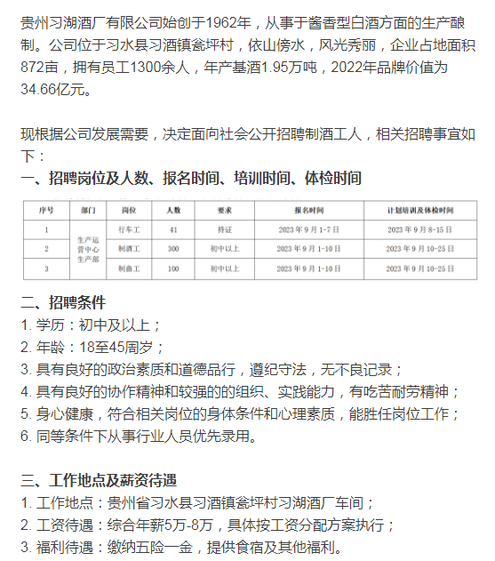 贵州习湖酒厂有限公司招聘!初中起报!年薪5~8万!五险一金+提供食宿!