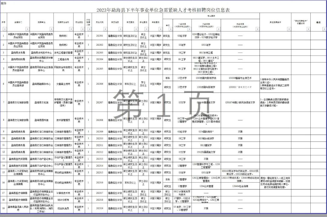 附件:附件1:2023年勐海县下半年事业单位急需紧缺人才考核招聘岗位信息表