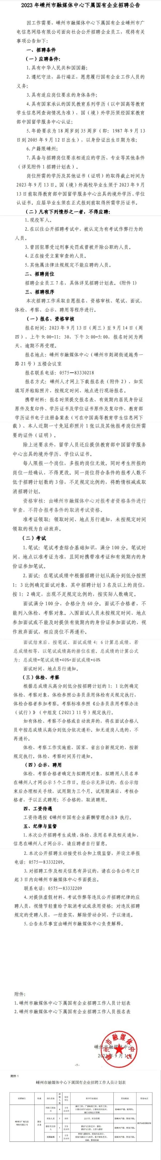 注意事项:2023年嵊州市融媒体中心下属国有企业招聘工作人员报名表请到嵊州人才网进行下载http://www.szrcw.com.cn/sxsz