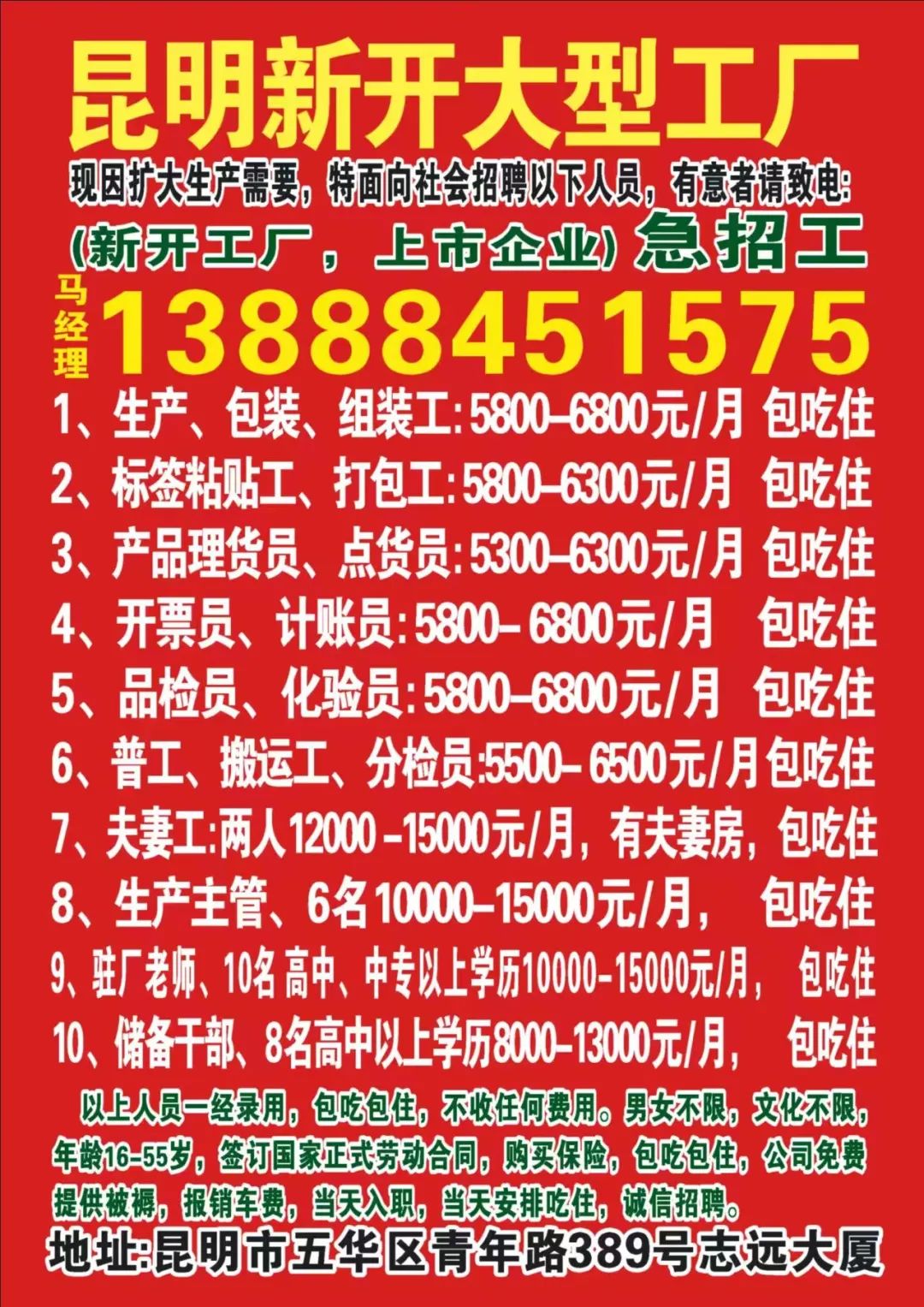 昆明新开大型工厂 急招工 工厂直招工(不收任何费用、上市企业、新开工厂、诚信招聘)
