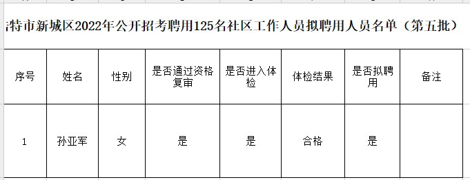 根据《呼和浩特市新城区2022年公开招考聘用125名社区工作人员简章》,经网上报名、资格初审、笔试、资格复审、体检等环节,现将呼和浩特市新城区2022年公开招考聘用125名社区工作人员中体检通过的1名拟聘用人员名单进行公示(名单详见附件)。后续待其他人员体检结束后再进行公示。