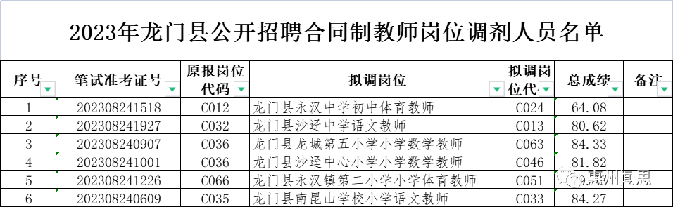2023年龙门县公开招聘合同制教师岗位调剂入选人员公告