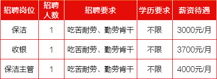 岗位要求:女,55岁以下,身体健康、品行兼优、有团队精神、能胜任本职工作