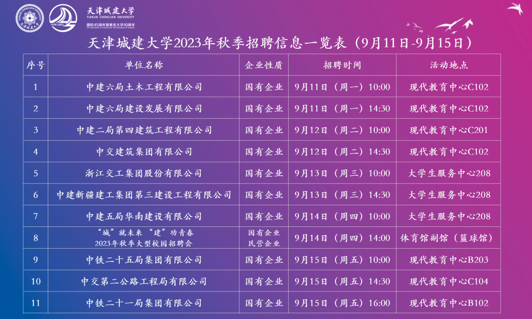 【招聘预告】天津城建大学2023年秋季校园招聘信息预告(9月11日-9月15日)