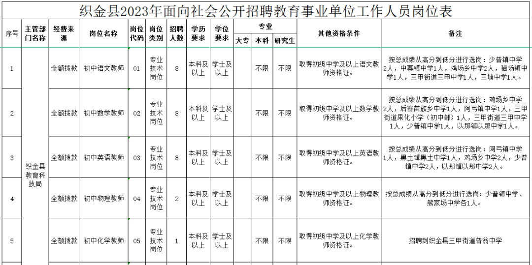 招聘岗位及要求详见《织金县2023年面向社会公开招聘教育事业单位工作人员岗位表》(以下简称《岗位表》,详见附件1),岗位专业要求参照贵州省人力资源和社会保障厅官网上的《事业单位公开招聘专业设置参考目录》设置。