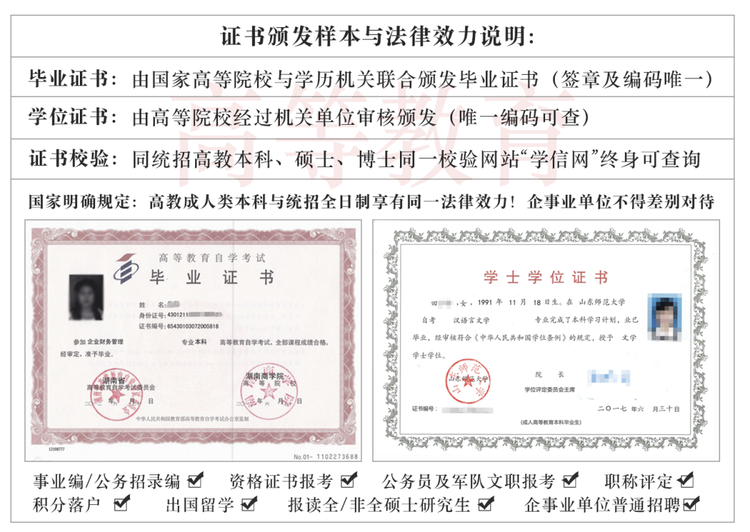 本次本科毕业证书、学位证书均为市自考办及主考院校盖章下发:教育局认证,国家认可,学信网(网址http://www.chsi.com.cn/)可查↓