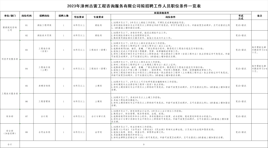 现根据业务发展需要,工程咨询公司(含下属合资子公司漳州古雷勘测规划咨询有限公司)拟面向社会公开考试择优聘用国有企业工作人员9名,现将招聘有关事项公布如下: