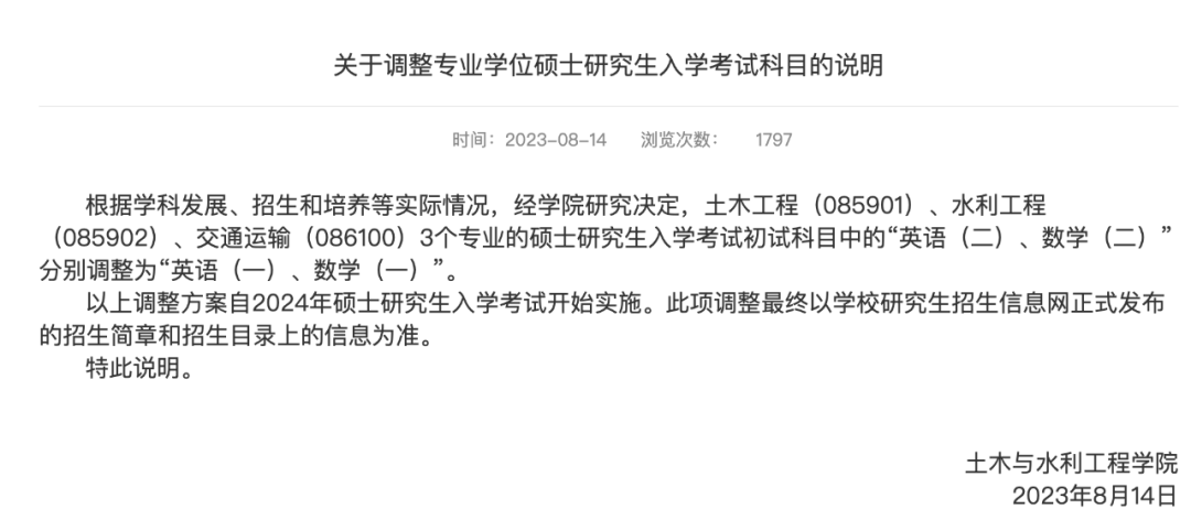 比如今年华中科技大学发布公告,土木工程(085901)、水利工程(085902)、交通运输(086100)3个专业的硕士研究生入学考试初试科目中的“英语二、数学二”分别调整为“英语一、数学一”。