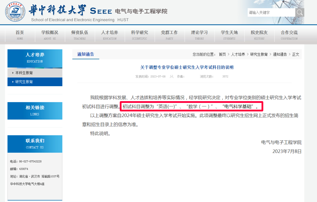 电气与电子工程学院发布了关于调整2024年专业学位硕士研究生入学考试科目的说明。该院决定对对专业学位类别的硕士研究生入学考试初试科目进行调整。初试科目调整为“英语(一)”、“数(一)”、“电气科学基础”。