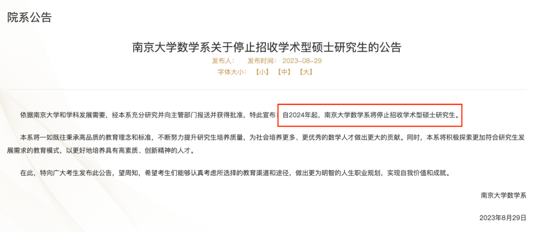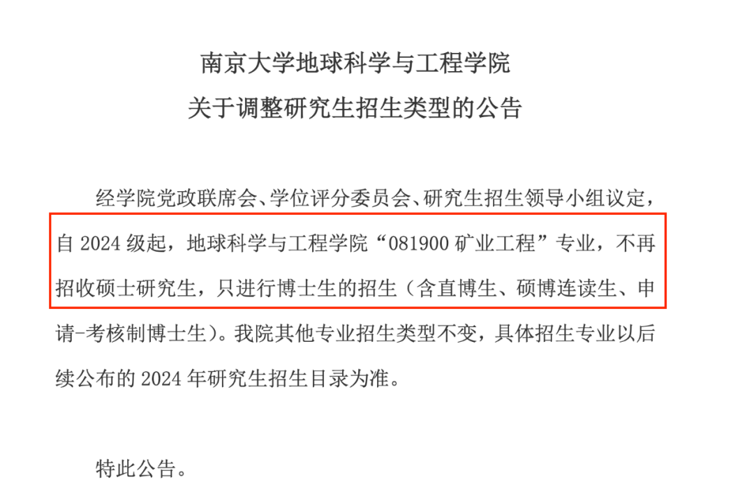 比如近日南京大学发布公告,南京大学数学系2024年起停止招收学硕,而南京大学地球科学与工程学院“081900矿业工程”专业,2024年起不再招收硕士研究生,只进行博士生的招生(含直博生、硕博连续生、申请-考核制博士生)。