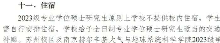南京大学更为直接,2023级专业学位硕士研究生原则上学校不提供校内住宿,学生需自行安排住宿,学校给予全日制专业学位硕士研究生适当的交通补贴。