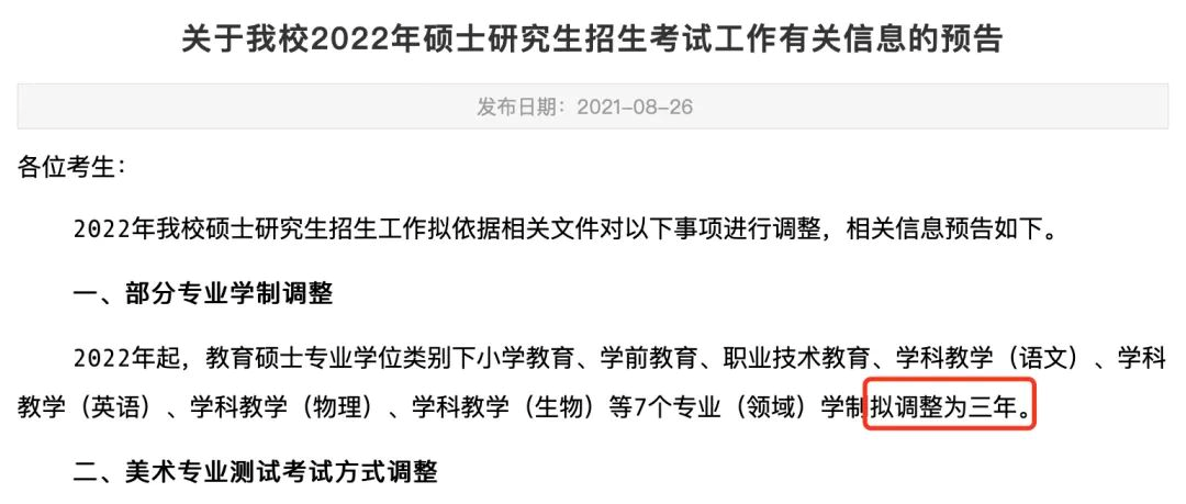 除此之外,河北师范大学发布通知:2022年起,教育硕士专业学位类别下小学教育、学前教育、职业技术教育等7个专业(领域)学制拟调整为三年。