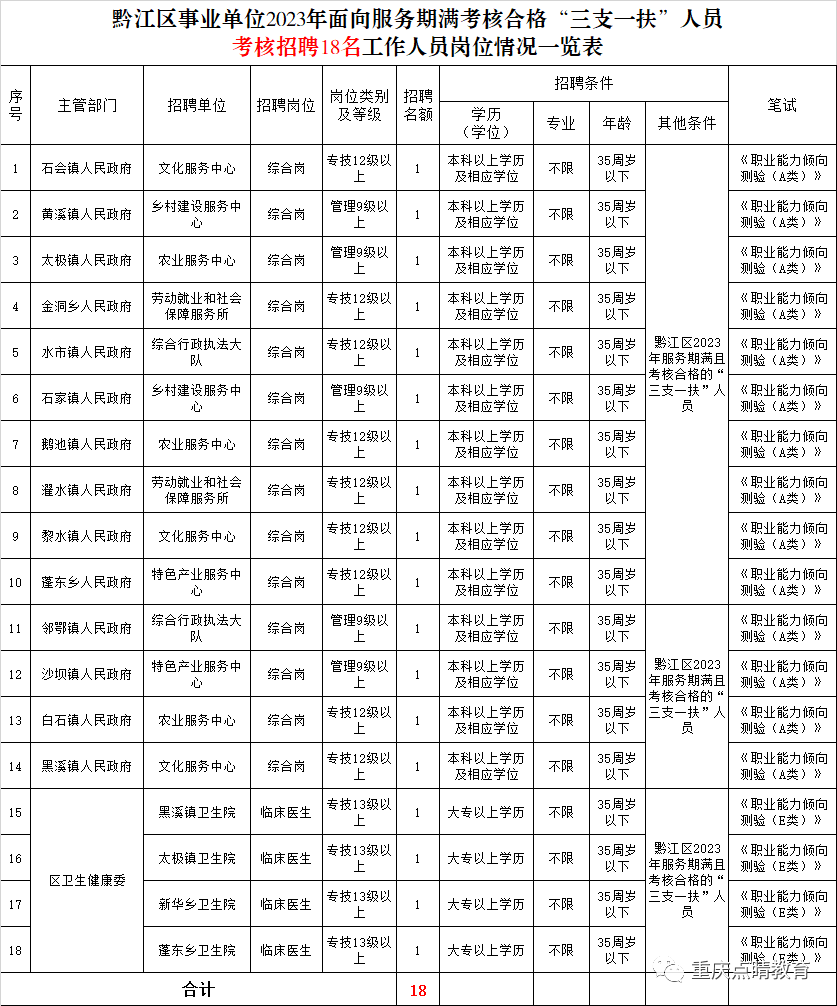 本次公开招聘黔江区2023年服务期满且考核合格的“三支一扶”人员18名。具体招聘单位、岗位及条件要求等详见附件1。