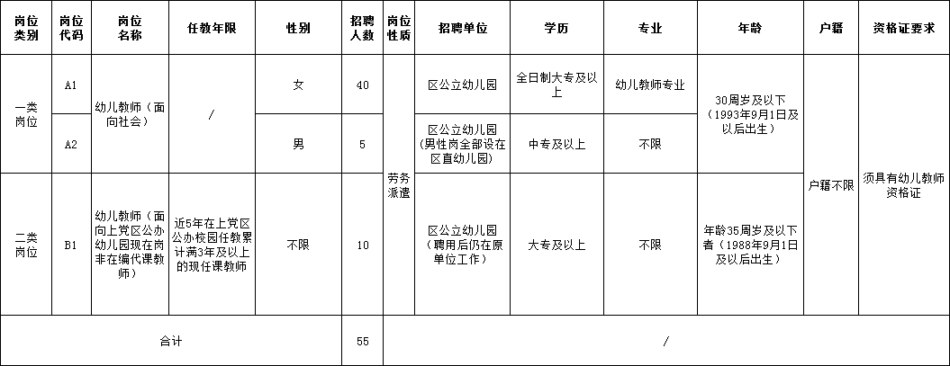 共计招聘幼儿教师55名,分两类岗位: