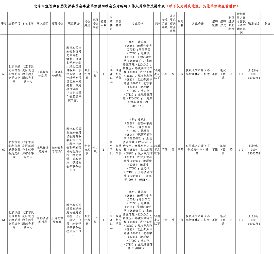 1. 北京市规划和自然资源委员会事业单位面向社会公开招聘工作人员职位及要求表