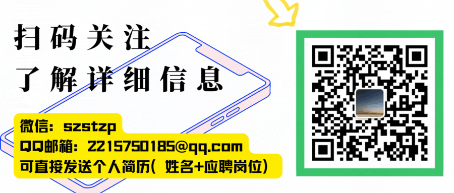 可直接发送个人简历(请备注好应聘的岗位名称,如“张三+厨师”)至QQ邮箱:2215750185@qq.com或者微信:szstzp了解更多的招聘信息。