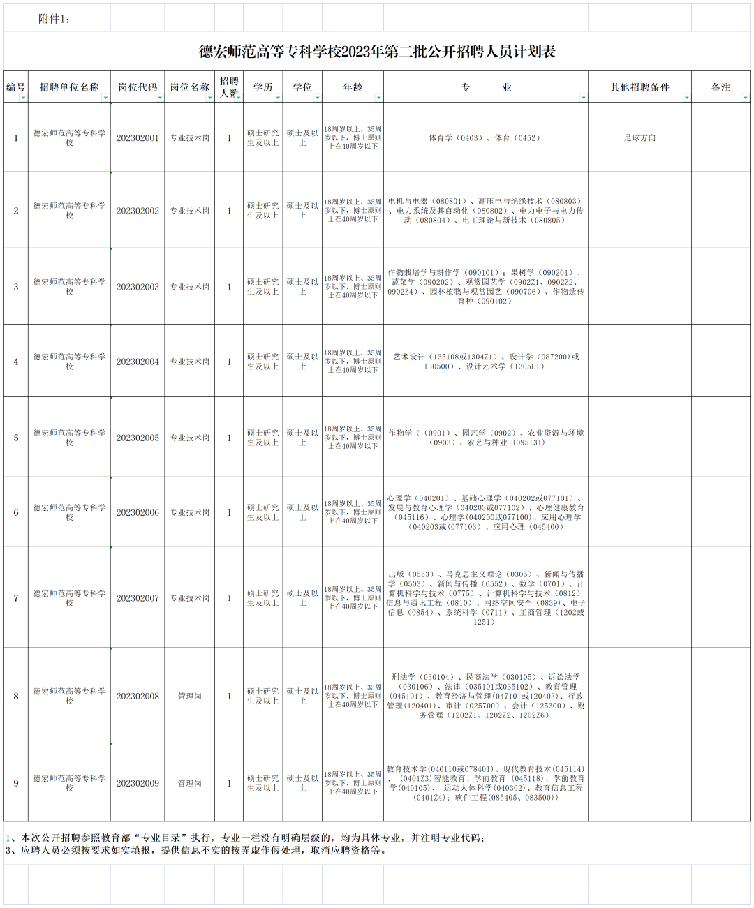 附件:1.2023年德宏师范高等专科学校公开招聘人员计划表;