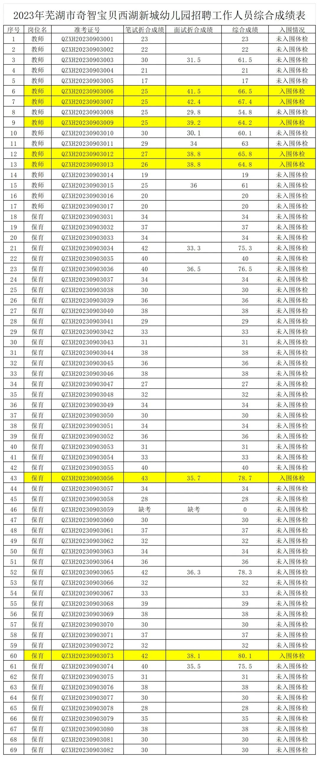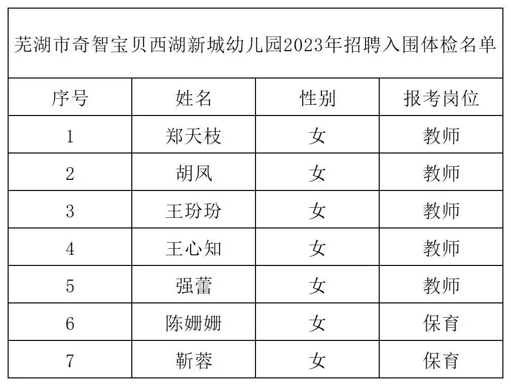 芜湖市奇智宝贝西湖新城幼儿园教职工招聘工作,经报名、笔试、专业测试,现将综合成绩、入围体检名单公布: