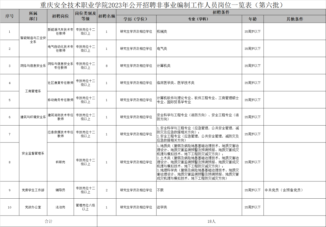 本次面向社会招聘非编工作人员18名,具体岗位条件详见《重庆安全技术职业学院2023年公开招聘非事业编制工作人员岗位一览表(第六批)》(附件1)。