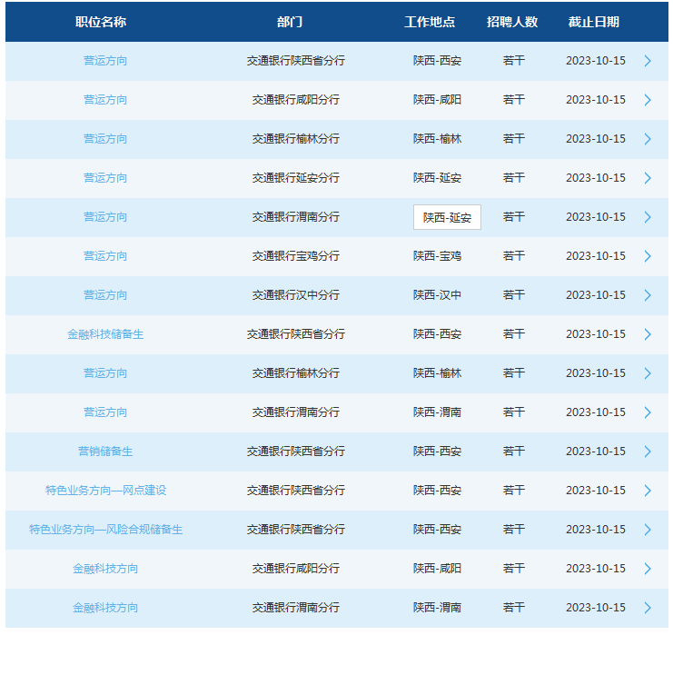2024交通银行秋季校园招聘报名时间截止10月15日。2024交通银行陕西省分行校园招聘岗位表如下: