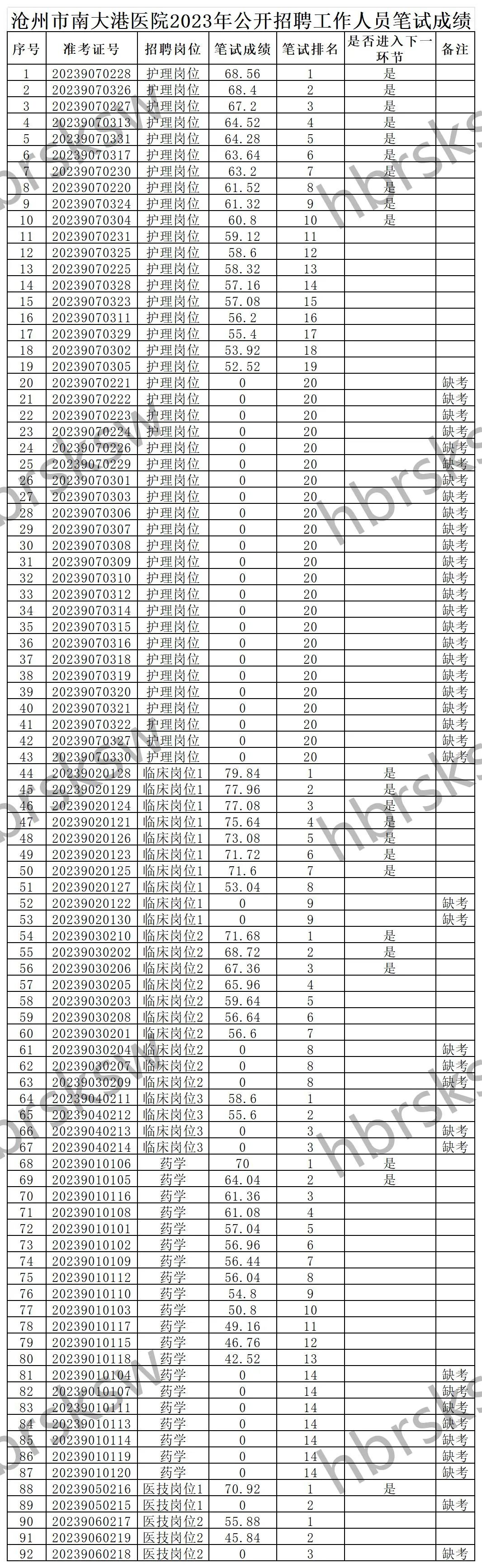 >沧州市南大港医院2023年公开招聘工作人员笔试成绩