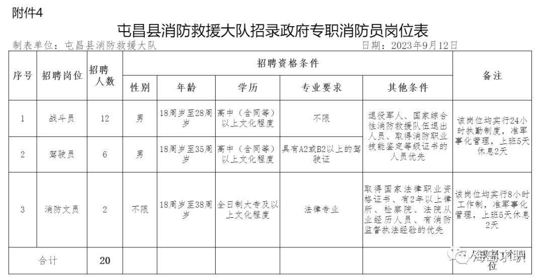 4.《2023年屯昌县消防救援大队招录政府专职消 防员岗位表》