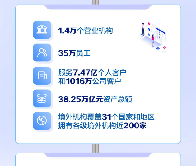 ”中国建设银行(China Construction Bank)2022年营收8224.73亿元,资产34.60万亿元,前身为成立于1954年10月1日的中国人民建设银行(后于1996年3月26日正式更名为中国建设银行)。总行位于北京金融大街25号, 是中央管理的国有大型商业银行,国家副部级单位。中国建设银行主要经营领域包括公司银行业务、个人银行业务和资金业务,在29个国家和地区设有分支机构及子公司,拥有基金、租赁、信托、人寿、财险、投行、期货、养老金等多个行业的子公司。