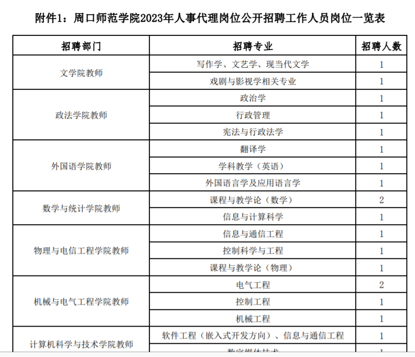 详见《周口师范学院2023年人事代理岗位公开招聘工作人员一览表》(附件1)。(报名指南附件在左下角“阅读原文”内)