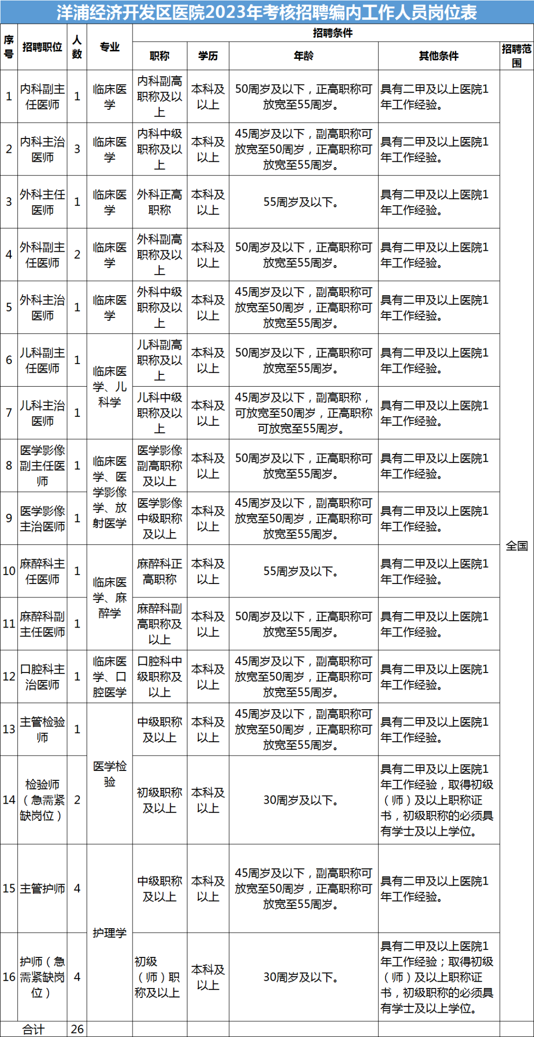 本次面向全国考核招聘编内工作人员26名,具体岗位条件详见(附件1)《洋浦经济开发区医院2023年考核招聘编内工作人员岗位表》。
