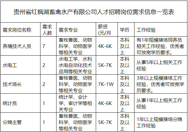 本次贵州省红枫湖畜禽水产有限公司共计招聘5个岗位共13人,上班地点均为罗甸县范围。具体详见《贵州省红枫湖畜禽水产有限公司人才招聘岗位需求信息一览表》。