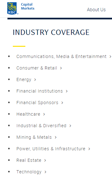 RBC的Global Investment Banking拥有1000多名投资银行专业人士,以行业为导向的专业服务主要覆盖核心市场的所有主要行业领域,包括Communications, Media & Entertainment、Consumer & Retail、Energy等。