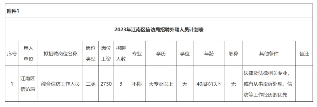 因工作需要,中共南宁市江南区委员会江南区人民政府信访局面向社会公开招聘编外聘用人员3名,现将有关事项公告如下:二类岗位:综合信访工作人员3名(岗位要求详见附件1)