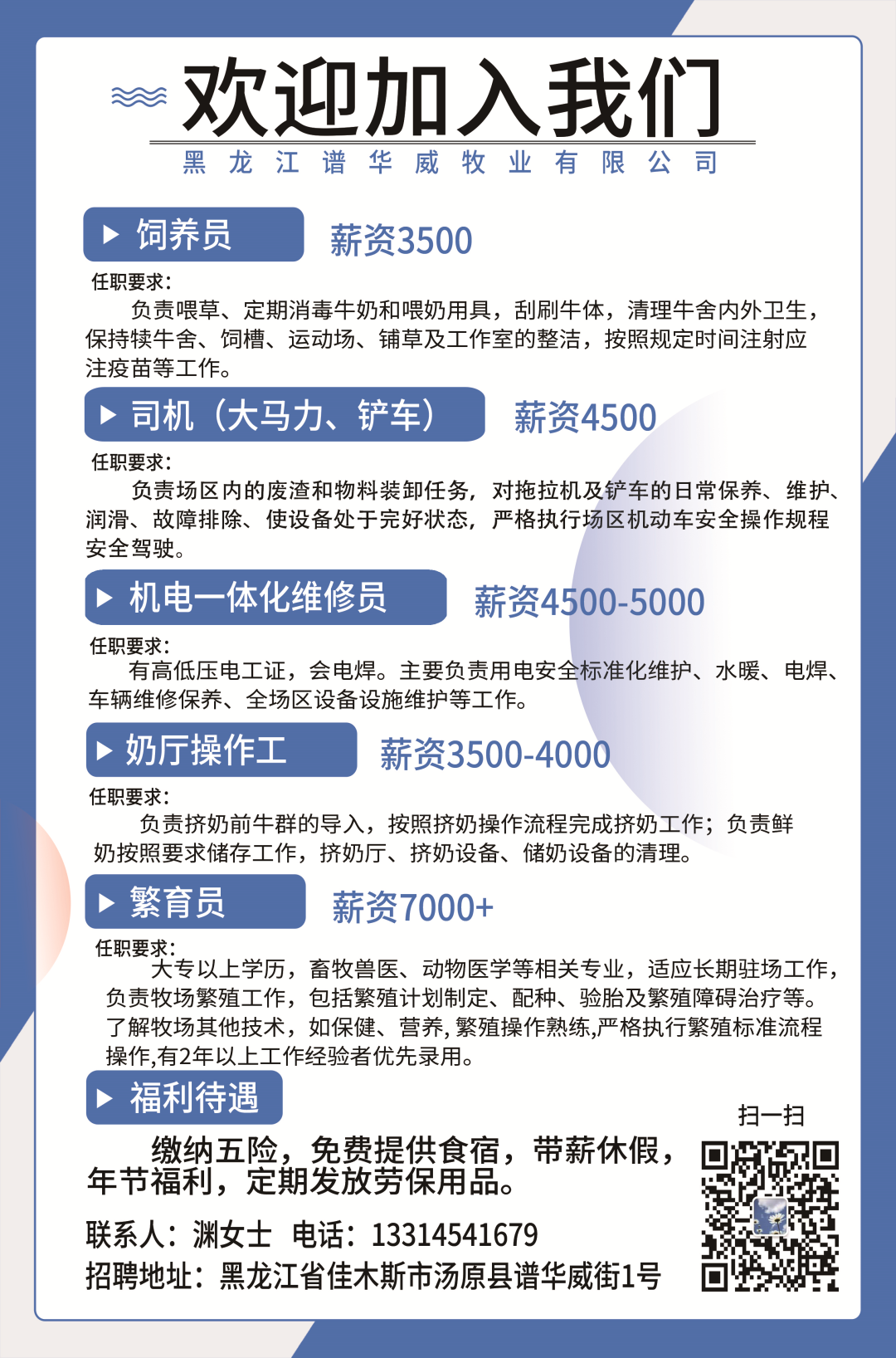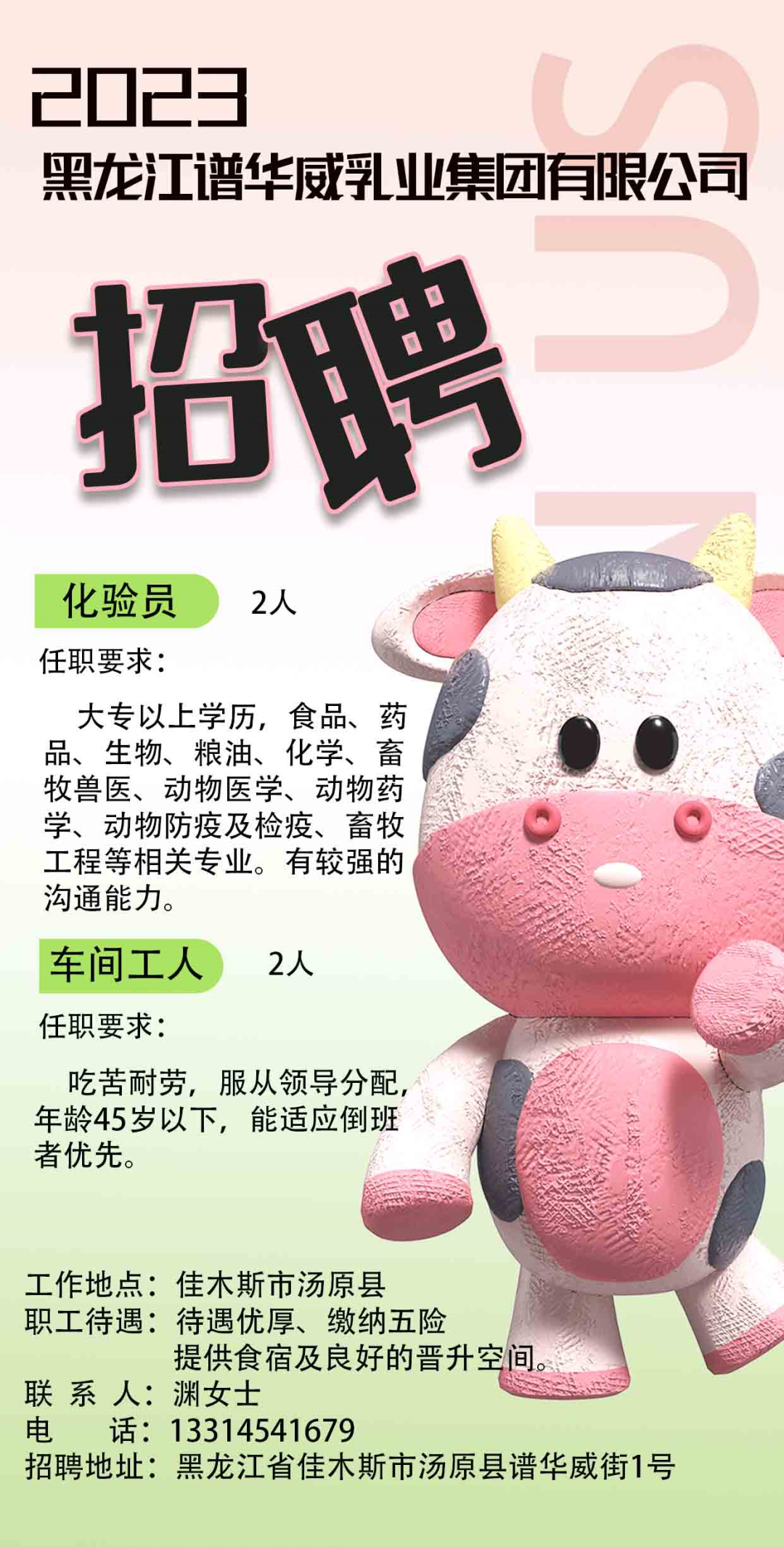 汤原县谱华威乳业集团有限公司招聘啦!详情如图,欢迎致电咨询加入我们。